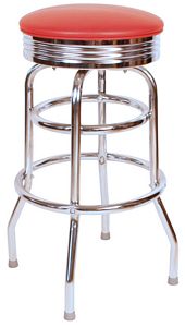 This is our red diner bar stool. This is bar stool is part of our quick ship line and comes standard with a 360 degree swivel. The side of the bar stool seat features a decorative ribbed pan. This commercial bar stool is built for both durability and comfort. This is a great way to dress up any bar, lounge, or counter service operation. This bar stool looks great at your breakfast bar or in your kitchen. The frame is made of 19 gauge chrome plated steel. This bar stool is made in the USA.