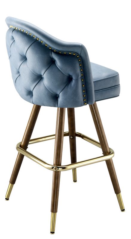 BarStoolsAndChairs carries the ultimate in bucket bar stools. This stool is built with a hand-upholstered luxury bucket featuring a deeply padded seat. The base is made of hand-turned wood with a walnut finish. The look is rich, luxurious, and solid. This bar stool comes standard with a 3 degree automatic return swivel. A brass foot rest completes the look. Made in the USA.