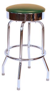 This is our quick ship 360 degree swivel bar stool featuring a decorative flat chrome pan around the side of the seat. This stool is built for both durability and comfort. This is a great way to dress up any bar, lounge, or counter service operation. This stool looks great at your breakfast bar or in your kitchen. The frame is made of 19 gauge chrome plated steel. This product is manufactured in the USA.