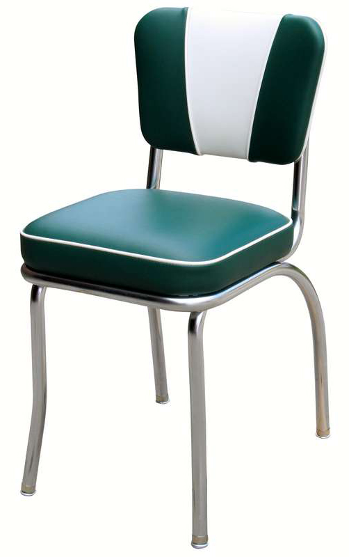 This V back diner chair is a great choice when looking for a retro diner chair. The Green V Back Diner Chair is upholstered in Naugahyde US344 Forest Green and Naugahyde US394 Adobe White. This diner chair looks great in any setting. It works well as a kitchen chair when trying to capture that retro diner look. The V Back Diner Chair is a commercial restaurant chair and built to stand the test of time.